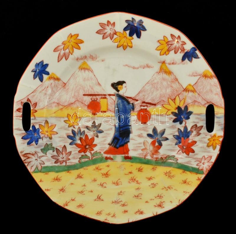 Leírás: Keleti motívummal díszített porcelán tényér, kézzel festett, jelzett, kopásnyomokkal, d: 25 cm