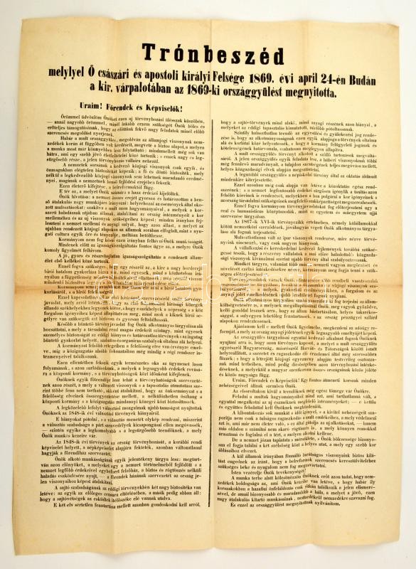 Leírás: 1869 Trónbeszéd, mellyel Ferenc József az Országgyűlés ülését megnyitotta. Nagyméretű plakát. 45x60 cm