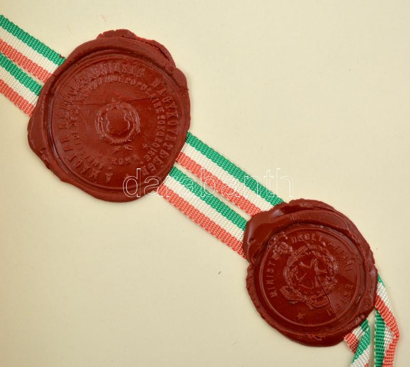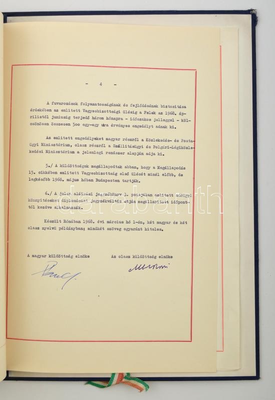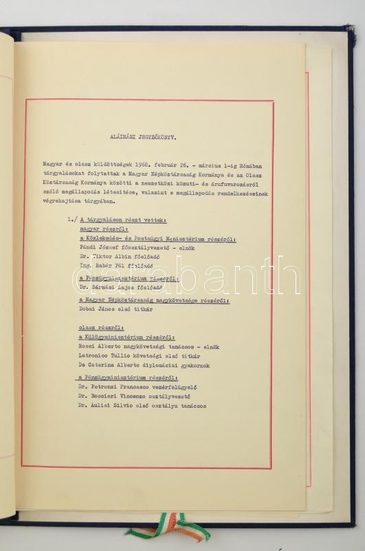 1968 A Magyarország és Olaszország közötti nemzetközi közúti- és árufuvarozásról szóló megállapodás aláírási jegyzőkönyve, benne Pándi József közlekedési minisztériumi főosztályvezető és Rossi Alberto nagykövetségi tanácsos aláírása, a magyar nagykövetség és az olasz Külügyminisztérium viaszpecsétjeivel
