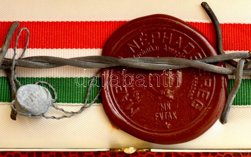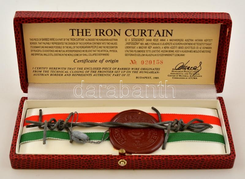 1989 Szögesdrót darab az osztrák-magyar határon húzódó vasfüggönyből (No.020158), 14×5,5 cm, tanúsítvánnyal./ Piece of barbed wire from the Iron Curtain (No. 020158), once along the Hungarian-Austrian border, with certification.