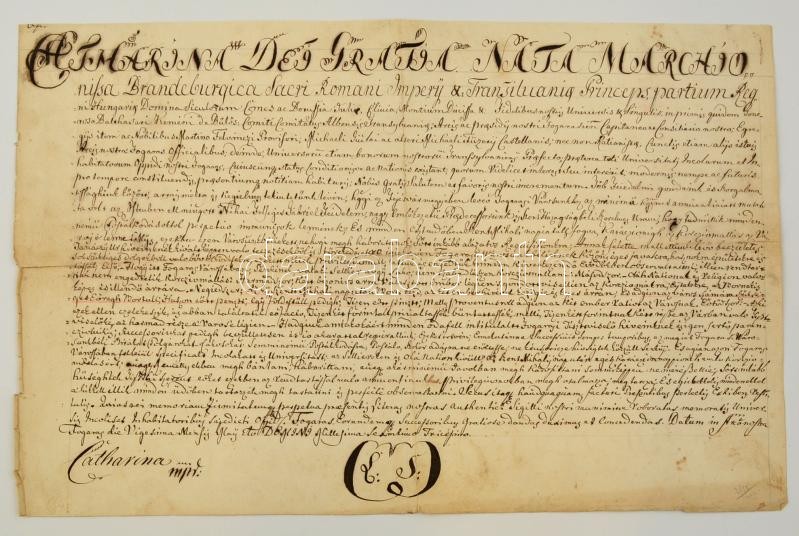 Leírás: cca 1800 Brandenburgi Katalin 1703-as oklevelének másolata részben magyar nyelven, Fogaras városával kapcsolatos ügyben 53x37 cm