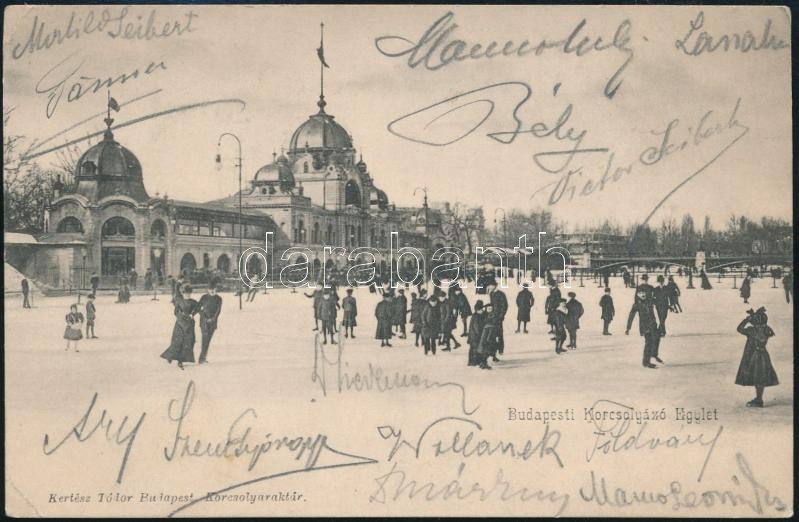 Leírás: cca 1913 Magyar korcsolya bajnok Manno Miltiades és más Városligeti korcsolyázók saját kezűleg aláírt, jégpályát ábrázoló képeslapja.