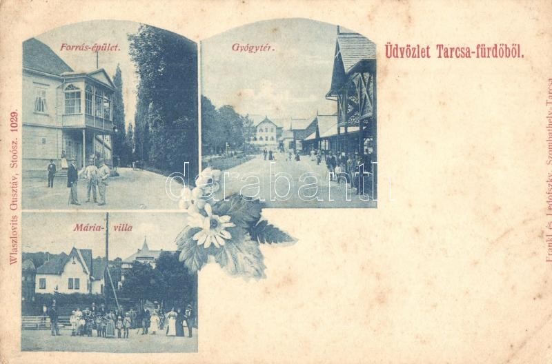 Tarcsafürdő, Bad Tatzmannsdorf; Forrás épület, gyógytér, Mária villa, Wlaszlovits Gusztáv kiadása / villa, spa, square, spring, floral Art Nouveau (vágott / cut)