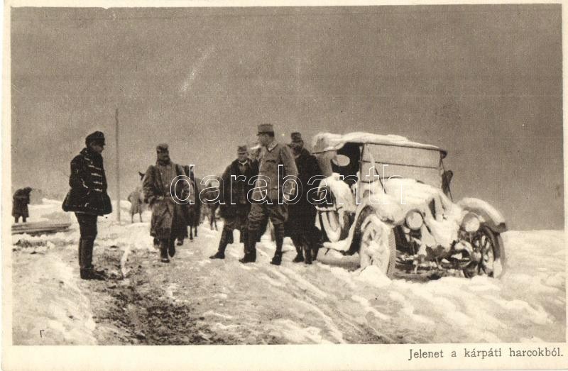 Leírás: Az Érdekes Újság kiadása: Jelenet a kárpáti harcokból / Carpathians, winter, soldiers, automobile (vágott / cut)