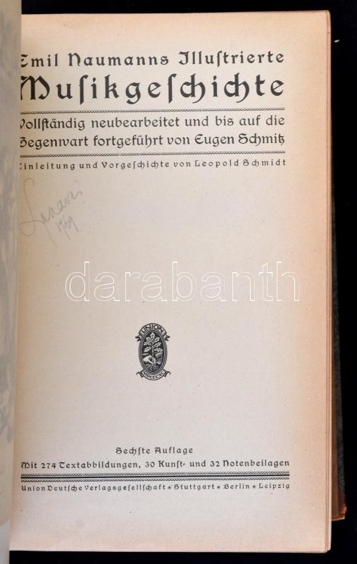 Emil Naumanns Illustrierte Musikgeschichte. Stuttgart-Berlin-Leipzig, é.n., Union Deutsche Verlagsgesellschaft. Hetedik kiadás. Kiadói félbőr-kötés, sérült gerinccel, német nyelven. / Half-linen-binding, with a little bit damaged spine, in German language.