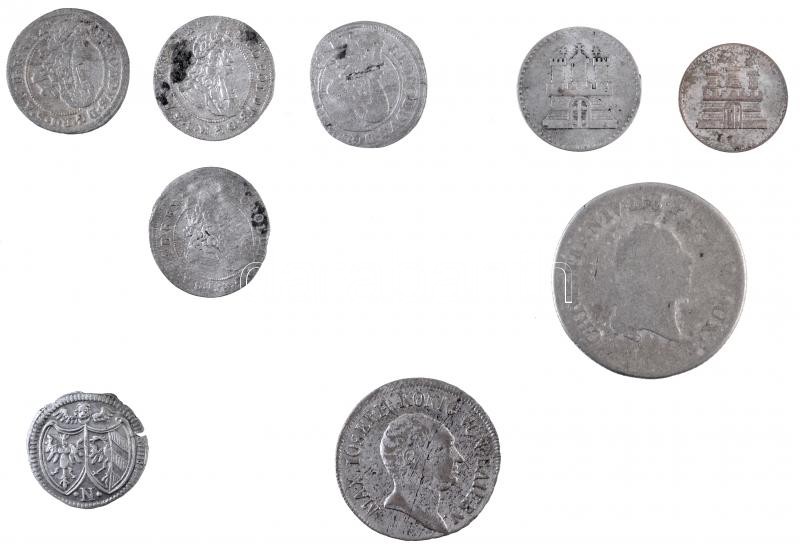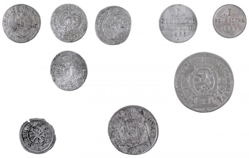 Német Államok vegyes váltópénz tétel, benne: Német Államok / Szilézia 1698CB 1kr Ag (0,73g) + 1700FN 1kr Ag (0,74g) + 1701CB 1kr Ag (0,63g) + 1702CB 1kr Ag "I. Lipót" (0,72g) + Nürnberg 1709. 1kr Ag (0,65g) + Pfalz-Birkenfeld-Zweibrücken 1764M 10kr Ag "IV. Krisztián" (3,76g) + Bajorország 1808. 6kr Ag "IV. Miksa József" (2,66g) + Hamburg 1855. Sechsling (6pf) Ag + 1855A 1Sch Ag (0,71g/1,02g) T:2-3 German States coin lot, including: Silesia 1698CB 1 Kreuzer Ag (0,73g) + 1700FN 1 Kreuzer Ag (0,74g) + 1701CB 1 Kreuzer Ag (0,63g) + 1702CB 1 Kreuzer Ag "Leopold I" (0,72g) + Nurnberg 1709. 1 Kreuzer Ag (0,65g) + Pfalz-Birkenfeld-Zweibrücken 1764M 10 Kreuzer "Christian IV" (3,76g) + Bavaria 1808. 6 Kreuzer Ag "Maximilian IV Josef" (2,66g) + Hamburg 1855. Sechsling (6 Pfennig) Ag + 1855A 1 Schilling Ag (0,71g/1,02g) C:XF-F