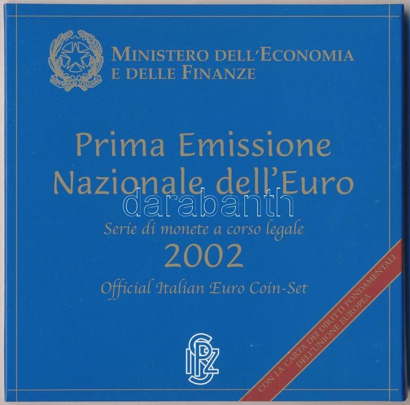Italy 2002. 1 Cent - 2 Euros (8x) coin set, "Prima Emissione Nazionale dell'Euro" in cardboard case C:UNC
