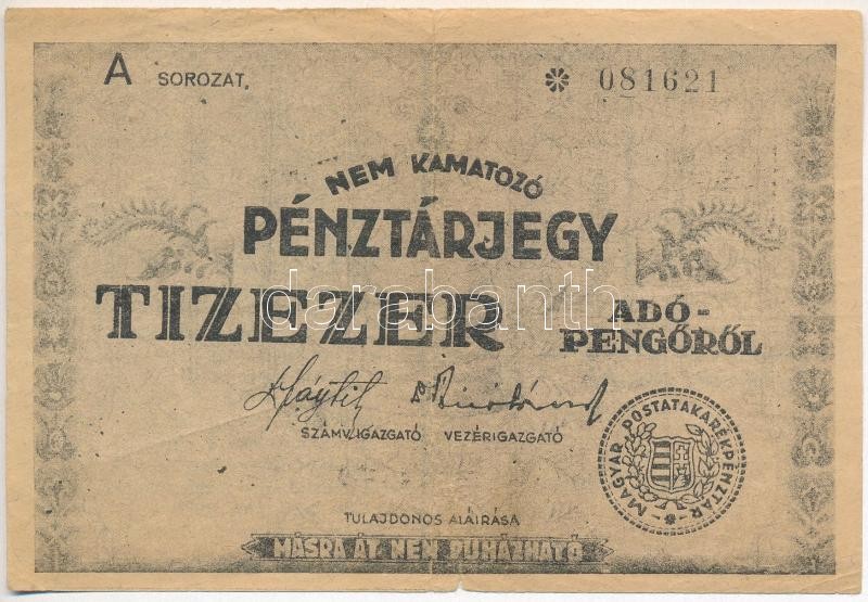 1946. 10.000AP nem kamatozó Pénztárjegy, "Másra Át Nem Ruházható" T:II... https://www.darabanth.com/hu/293-Gyorsarveres/293.0/Numizmatika/Magyar-bankjegyek~300007/1946-10000AP-nem-kamatozo-Penztarjegy-Masra-At-Nem-Ruhazhato-TIII-szakadas~II1553563