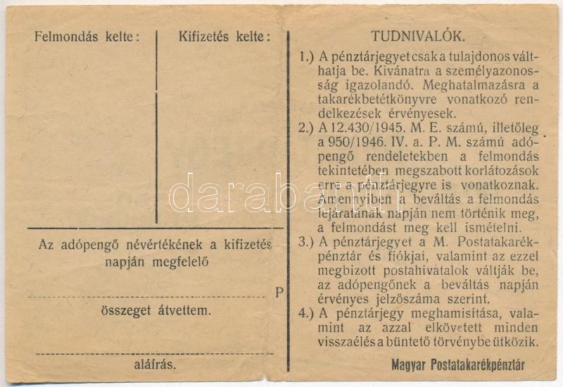 Leírás: 1946. 10.000AP nem kamatozó Pénztárjegy, "Másra Át Nem Ruházható" T:III szakadás