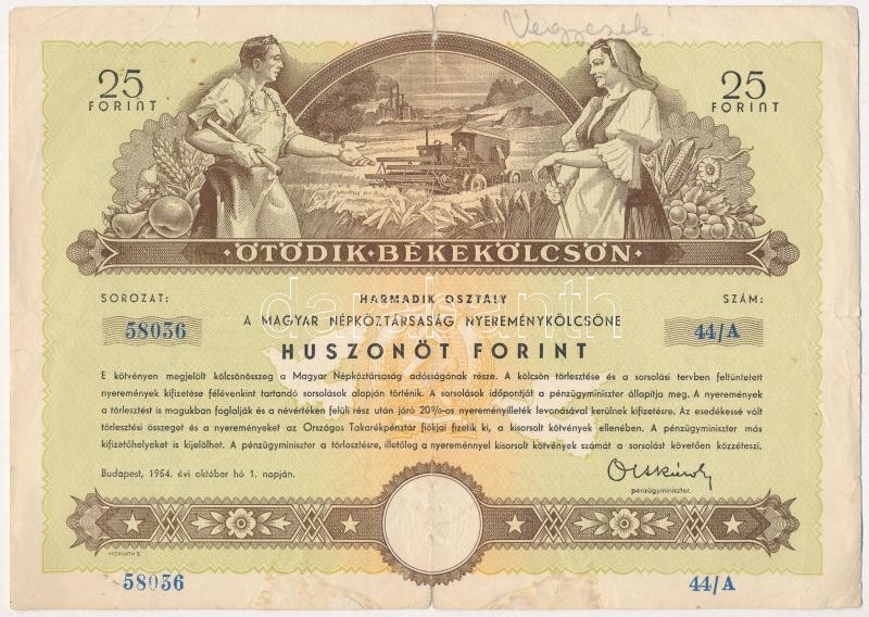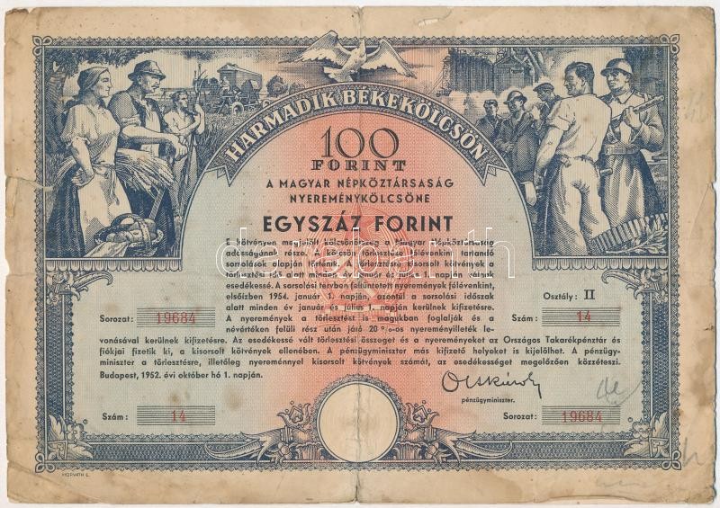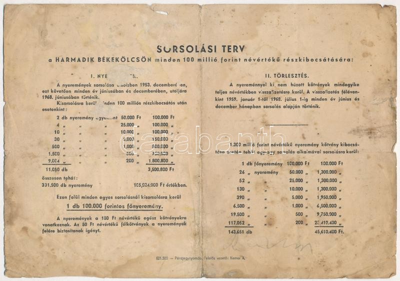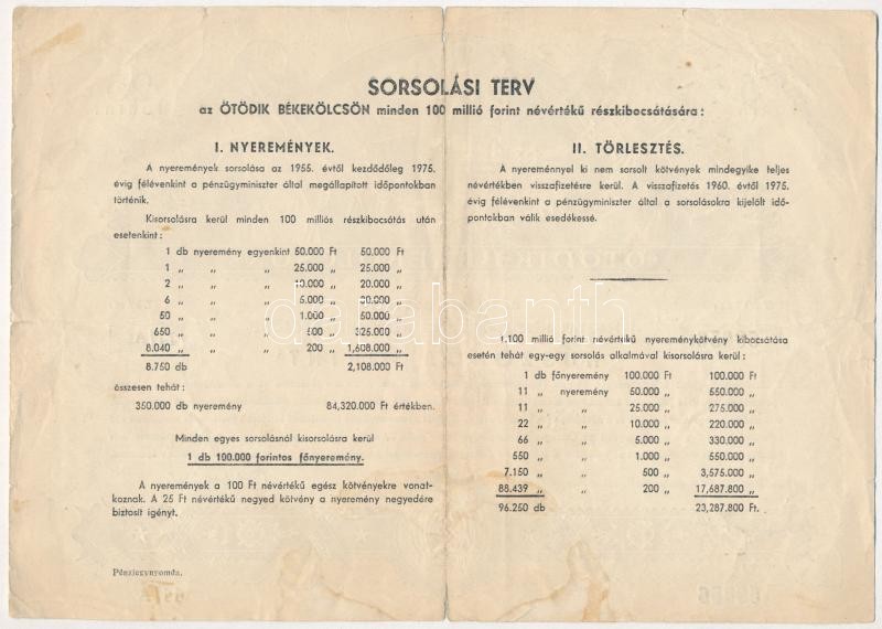 Leírás: Budapest 1952. "Harmadik Békekölcsön" sorsjegy 100Ft-ról, szárazpecséttel + 1954. "Ötödik Békekölcsön" sorsjegy 25Ft-ról, szárazpecséttel T:III-