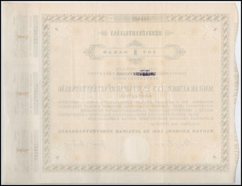 Leírás: Szeged 1940. "A Szegedi Kereskedelmi és Iparbank" névre szóló részvénye 250P-ről, szárazpecséttel, bélyegzéssel és szelvényekkel T:II