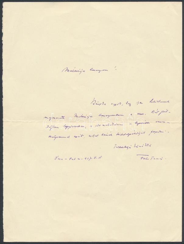 1917 Falu Tamás (1881-1977) saját kézzel írt levele, aláírással Hegedüs Rózsának. Hegedüs Sándor politikus és Jókay Jolán lányának, ifj. Hegedüs Sándor író és Hegedüs Loránt politikus hugának, dátumozva (1917. II. 15.), Ócsa.