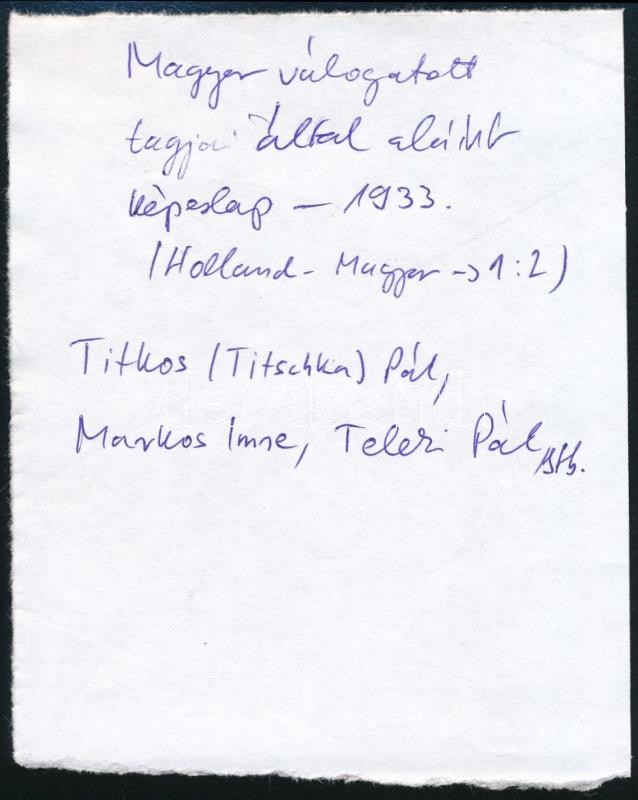 1933 A magyar válogatott tagjainak (Titkos Pál, Markos Imre, Teleki Pál, stb.) aláírásai Hollandiából Fröhlich Sándor labdarúgó részére küldött levelezőlapon