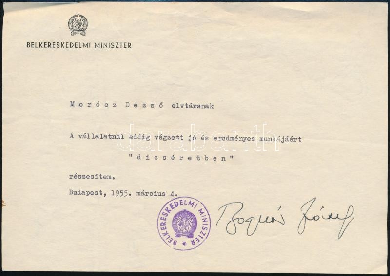 Leírás: 1955 Bognár József (1917-1996) belkereskedelmi miniszter aláírása, egy minisztériumi "dicséretben" részesítő okmányon.