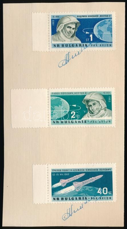 Adrijan Nyikolajev (1929-2004) szovjet űrhajós aláírásai bolgár bélyegsoron /