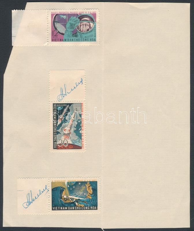 Adrijan Nyikolajev (1929-2004) szovjet űrhajós aláírásai vietnami bélyegsoron /