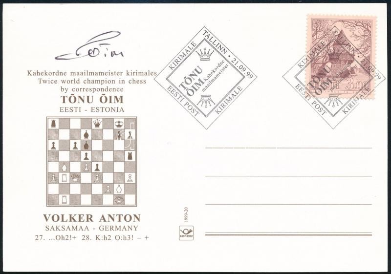 Leírás: Tonu Oim (1941- ) észt levelezési sakk-világbajnok aláírása észt sakk-levelezőlapon