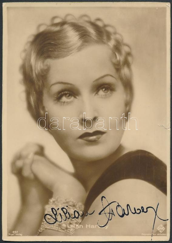 cca 1940 Lilian Harvey (1906-1968) brit-német színésznő saját kezű alá... https://www.darabanth.com/hu/294-Gyorsarveres/294.0/Festmeny-mutargy-papirregiseg-egyeb/Alairas~200018/cca-1940-Lilian-Harvey-1906-1968-brit-nemet-szineszno-sajat-kezu-alairasa-az-ot-abrazo~II1560407