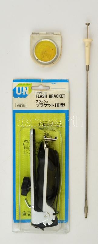 Leírás: Kis fényképező kellék tétel: japán külső vakutartó eredeti csomagolásában, kioldózsinór, sárga színszűrő előtétlencse