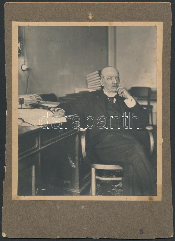 Leírás: 1914 dr. Farkas Lajos (1841-1921) neves jogász, akadémikus, egyetemi tanár fényképe tanári szobájában. 14x18 cm