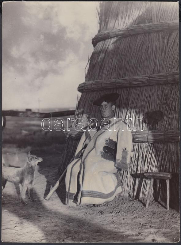 Leírás: 1930 Kerny István (1879-1963): Gulyás a Hortobágyon cifra szűrben, hűséges kutyájával, pecséttel jelzett vintage fotó, 23x17cm