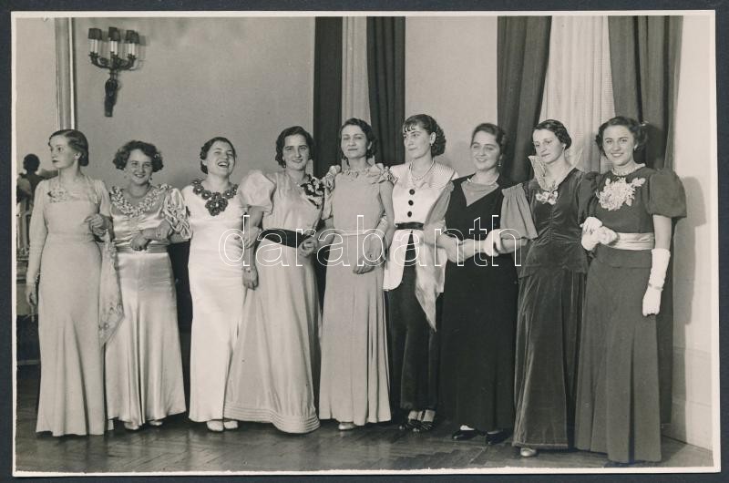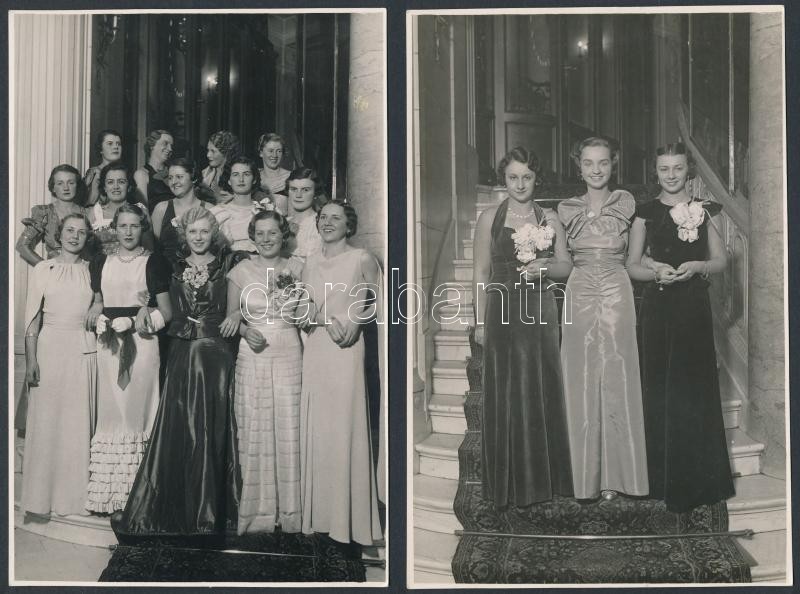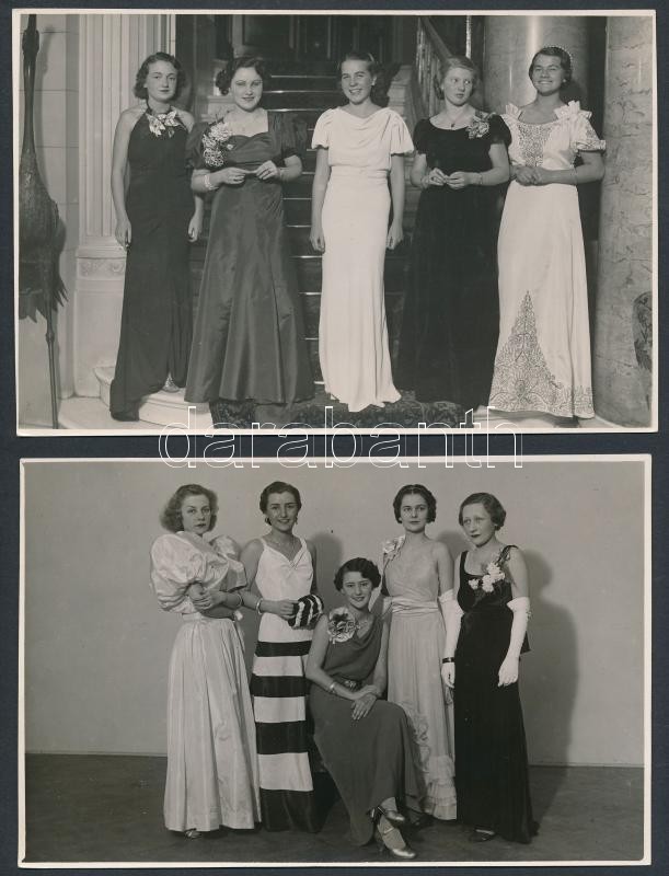 Leírás: 1935 Budapest, báli ruhák divatja, 5 db pecséttel jelzett, feliratozott vintage fotó, 11,5x17 cm
