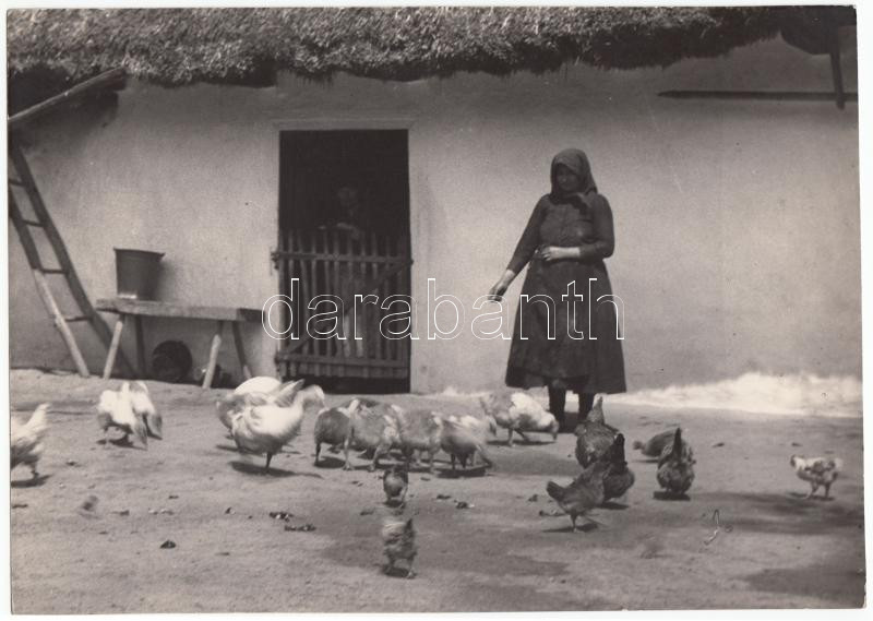 Leírás: cca 1920-1930 Kerny István (1879-1963): Aprójószág etetése Szurdokpüspökiben. Vintage fotó, hátoldalán szerzői pecséttel jelzett, 16x22cm