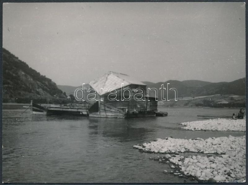 cca 1925 Vízre telepített hajómalom, vintage üveglemez negatív (4x6 cm) és az erről készült vintage nagyítás (8x11 cm), Kerny István (1879-1963) hagyatékából