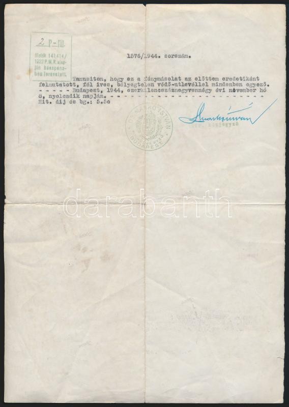 1944 Fényképes Schutzpass másolata Kellner Ferencné Klopfer Berta (189... https://www.darabanth.com/hu/294-Gyorsarveres/294.0/Festmeny-mutargy-papirregiseg-egyeb/Judaika~200023/1944-Fenykepes-Schutzpass-masolata-Kellner-Ferencne-Klopfer-Berta-1894-1977-reszere-kozjeg~II1557454