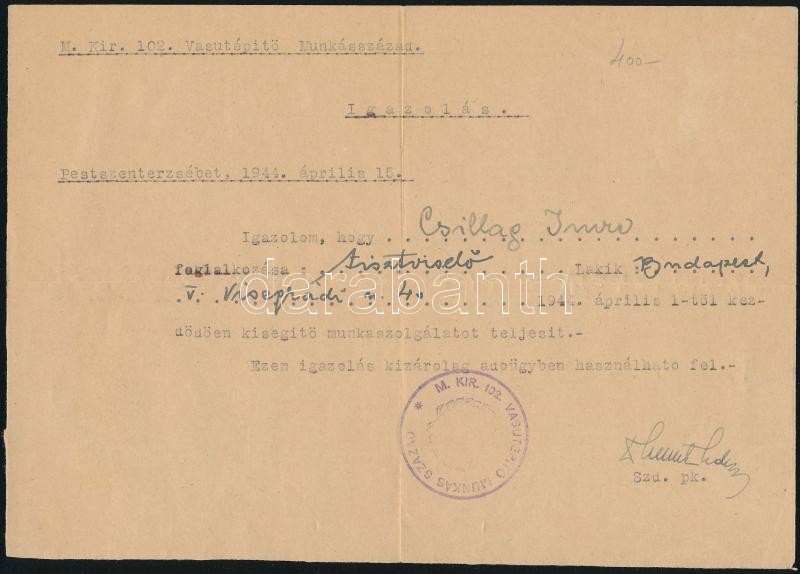 Leírás: 1944 Vasútépítő munkaszolgálat igazolása