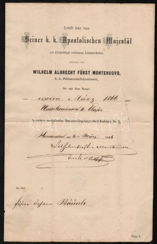 Leírás: 1866 Hermannstadt, Wilhelm Albrecht Fürst Montenouvo által sajátkezűleg aláírt kinevezési okirat (Radetzky 5. huszárregiment)