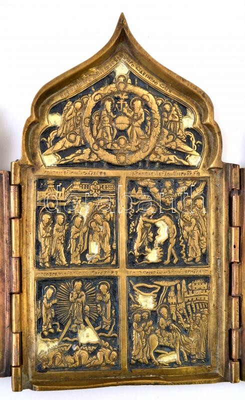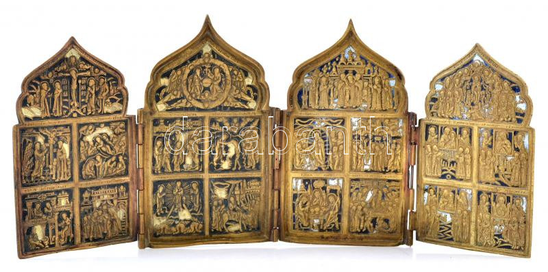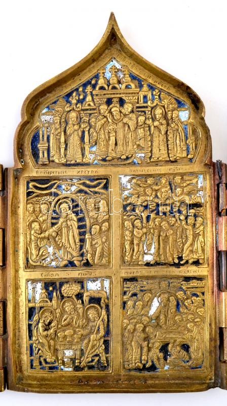 cca 1900 Orosz utazó ikon (poliptychon), bronz, erősen hiányos zománc díszítéssel, egyik zsanér sérült, 16×9 (összecsukva) 16×36 cm (kinyitva) /