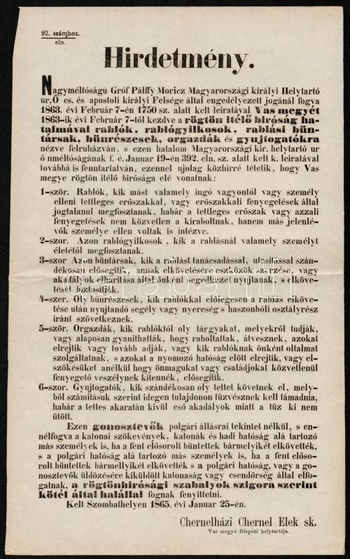 1865 Rögtönítélő bíróság felállításáról szóló hirdetmény https://www.darabanth.com/hu/294-Gyorsarveres/294.0/Festmeny-mutargy-papirregiseg-egyeb/Nyomtatvanyok~200027/1865-Rogtonitelo-birosag-felallitasarol-szolo-hirdetmeny~II1563106