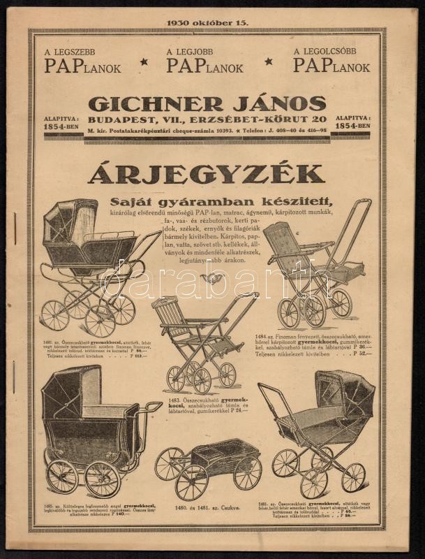 1930 Bp. VII., Gichner János saját gyártású gyerekkocsi, kisbútor és l... https://www.darabanth.com/hu/294-Gyorsarveres/294.0/Festmeny-mutargy-papirregiseg-egyeb/Nyomtatvanyok~200027/1930-Bp-VII-Gichner-Janos-sajat-gyartasu-gyerekkocsi-kisbutor-es-lakasfelszerelesenek-~II1561651