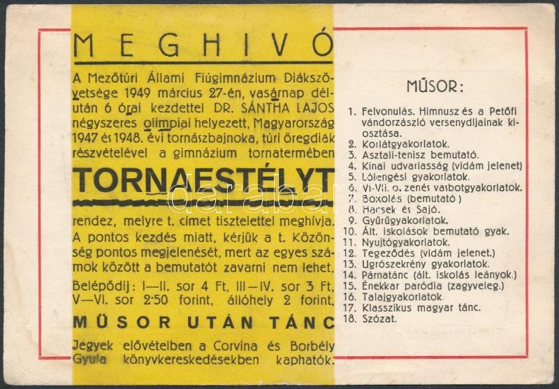 Leírás: 1949 Meghívó a Mezőtúri Állami Fiúgimnázium Diákszövetsége által rendezett tornaestélyre, Dr. Sántha Lajos olimpiai helyezett részvételével