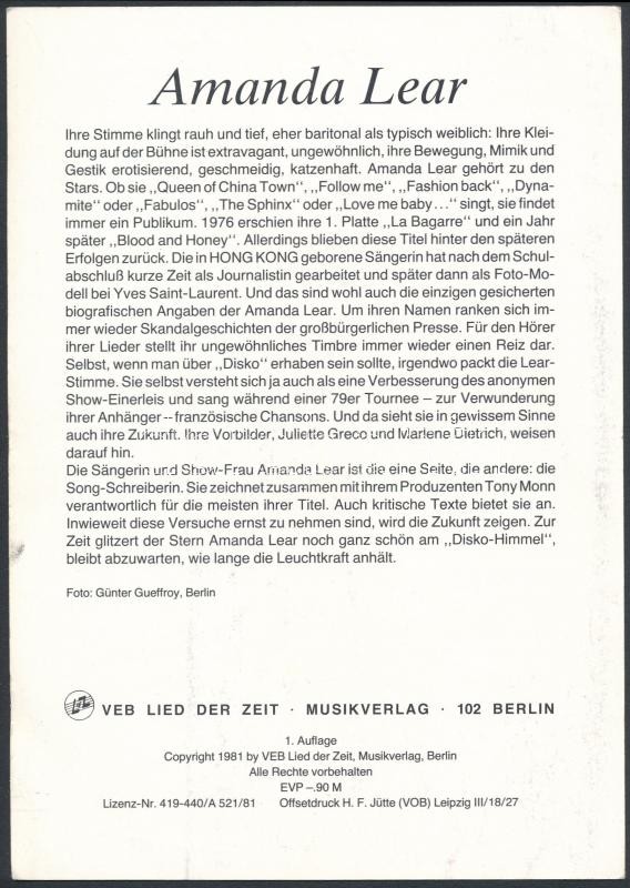 Leírás: 1981 Amanda Lear (1939-) énekesnő életét röviden ismertető reklámnyomtatvány