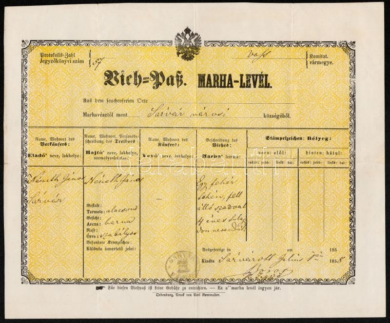1858 Sárvár magyar és német nyelvű marhalevél https://www.darabanth.com/hu/294-Gyorsarveres/294.0/Festmeny-mutargy-papirregiseg-egyeb/Okmanyok~200016/1858-Sarvar-magyar-es-nemet-nyelvu-marhalevel~II1555713