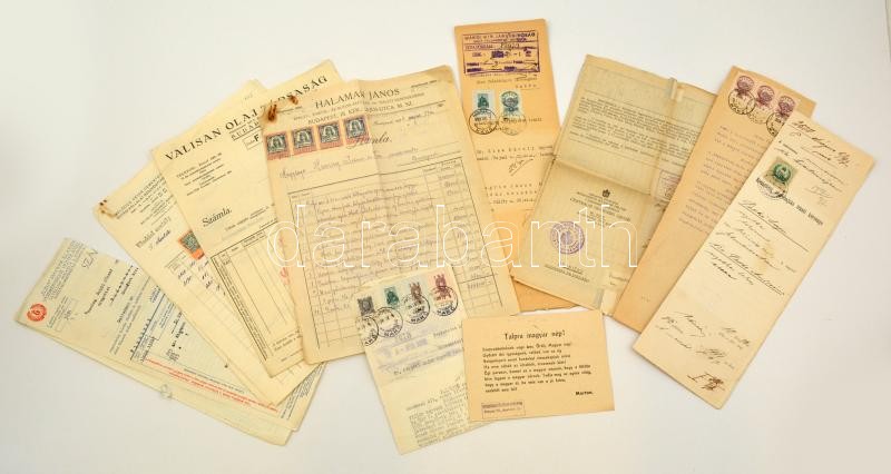 1897-1944 Okmánybélyeges ügyvédi iratok, fejléces számlák, 10 db (jelzálog, végrehajtás, Halaman János, Valisan Olaj Társaság, Melocco Péter Cementgyár, stb.)