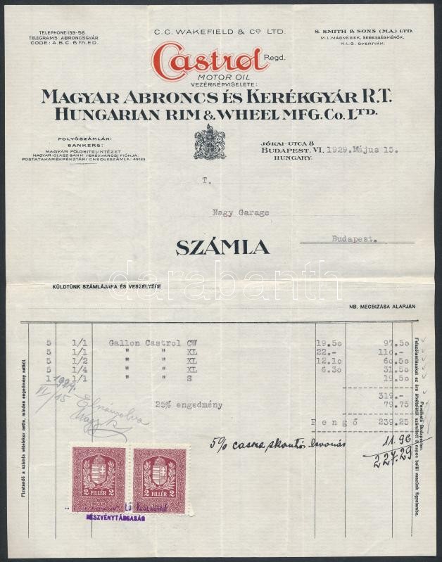Leírás: 1929 Magyar Abroncs- és Kerékgyár Rt. díszes fejléces számla, okmánybélyeggel
