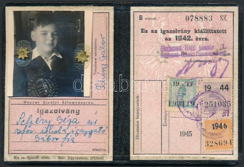 1942 A Magyar Királyi Államvasutak félárú jegy váltására jogosító fény... https://www.darabanth.com/hu/294-Gyorsarveres/294.0/Festmeny-mutargy-papirregiseg-egyeb/Okmanyok~200016/1942-A-Magyar-Kiralyi-Allamvasutak-felaru-jegy-valtasara-jogosito-fenykepes-igazolvanya~II1520753