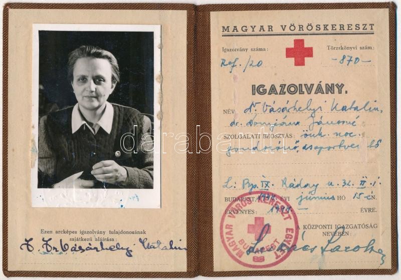 1944 Bp., A Magyar Vöröskereszt által kiállított fényképes igazolvány https://www.darabanth.com/hu/294-Gyorsarveres/294.0/Festmeny-mutargy-papirregiseg-egyeb/Okmanyok~200016/1944-Bp-A-Magyar-Voroskereszt-altal-kiallitott-fenykepes-igazolvany~II1559260