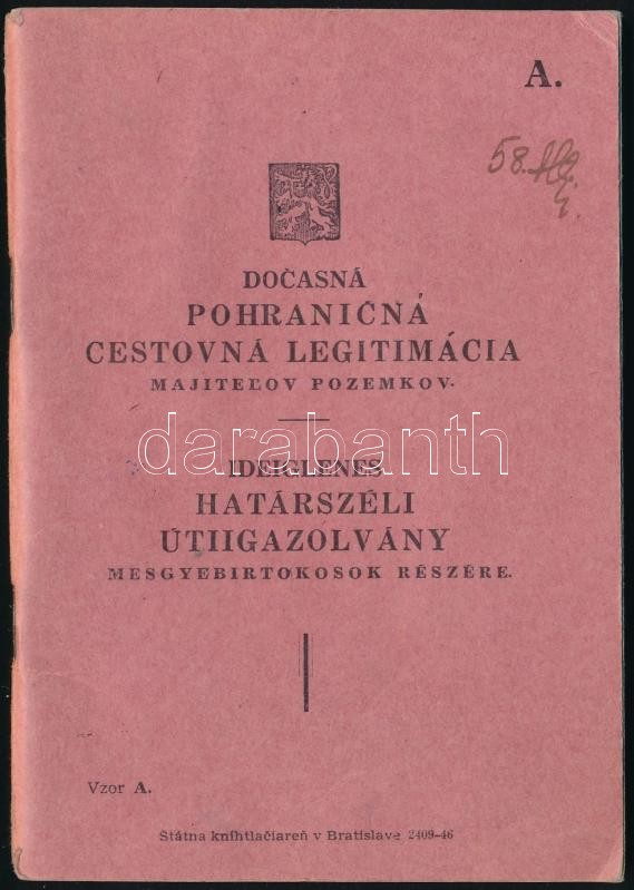 1948 Ideiglenes Határszéli Útiigazolvány megyebirtokosok részére, fényképpel, magyar és cseh nyelven./ 1948 Temporary Border Travel Card, with photo, Hungarian and Czech language.