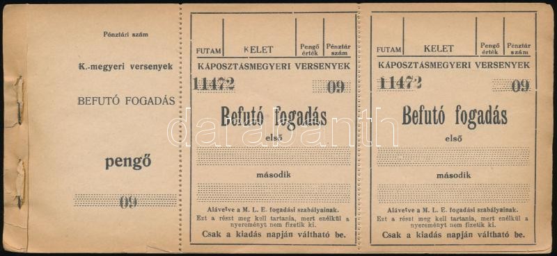 Leírás: cca 1927-1946 Káposztásmegyeri versenyek, megkezdett, kitöltetlen lóverseny fogadószelvény blokk