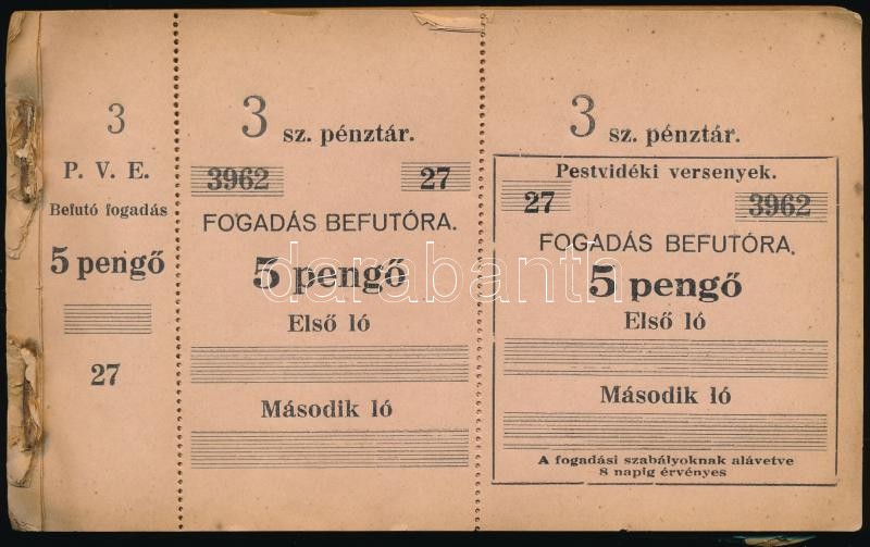 Leírás: cca 1927-1946 Pestvidéki versenyek, megkezdett, kitöltetlen lóverseny fogadószelvény blokk