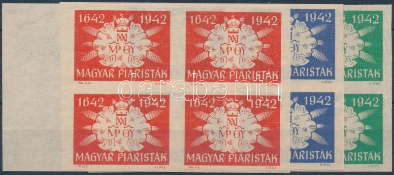 Leírás: 1942 Magyar Piaristák 3 db klf színű levélzáró ívszéli négyestömb