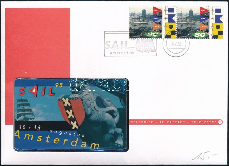 Leírás: 1995 Amsterdam Sail 95 bontatlan gyűjtői telefonkártya, bélyegzett borítékban