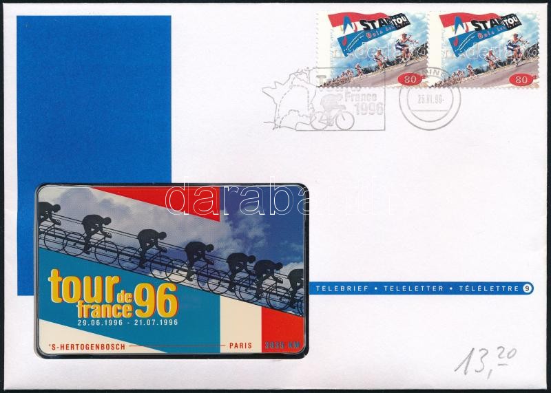 Leírás: 1996 Tour de France bontatlan gyűjtői telefonkártya, bélyegzett borítékban