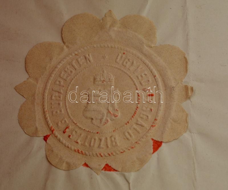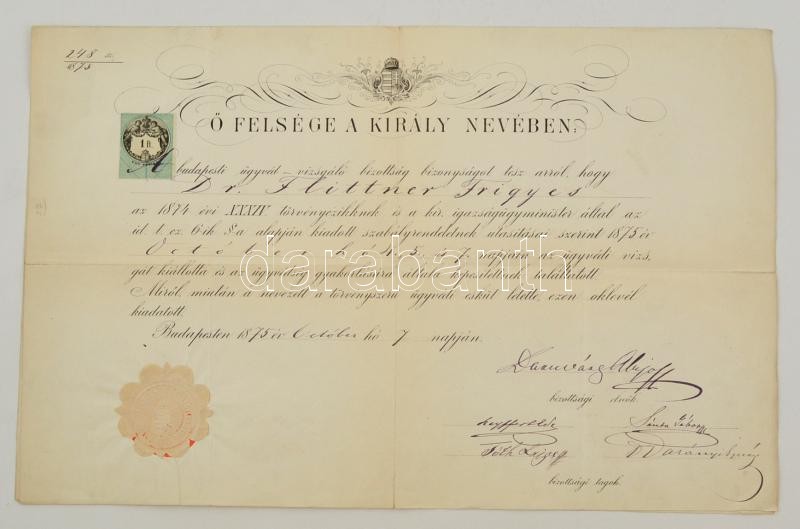 1875 Az ügyvédvizsgáló bizottság képesítő oklevele Flittner Frigyes (?-?) ügyvéd, az Osztrák-Magyar Bank jogtanácsosa részére, a bizottság tagjai, neves jogászok (Daruváry Alajos, Darányi Ignác, Szeyffert Ede, Tóth Lajos, Sánta Gábor) aláírásával, okmánybélyeggel