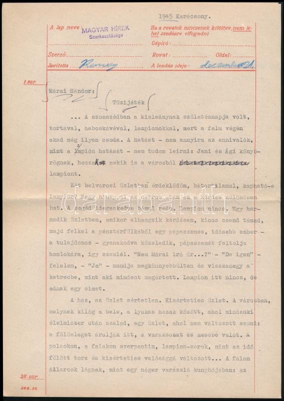 1945 Márai Sándor (1900-1989) írónak a Magyar Hírekben megjelent két í... https://www.darabanth.com/hu/294-Gyorsarveres/294.0/Festmeny-mutargy-papirregiseg-egyeb/Tortenelmi-dokumentumok-keziratok-erdekessegek~200017/1945-Marai-Sandor-1900-1989-ironak-a-Magyar-Hirekben-megjelent-ket-irasanak-nyomdai-korre~II1561512