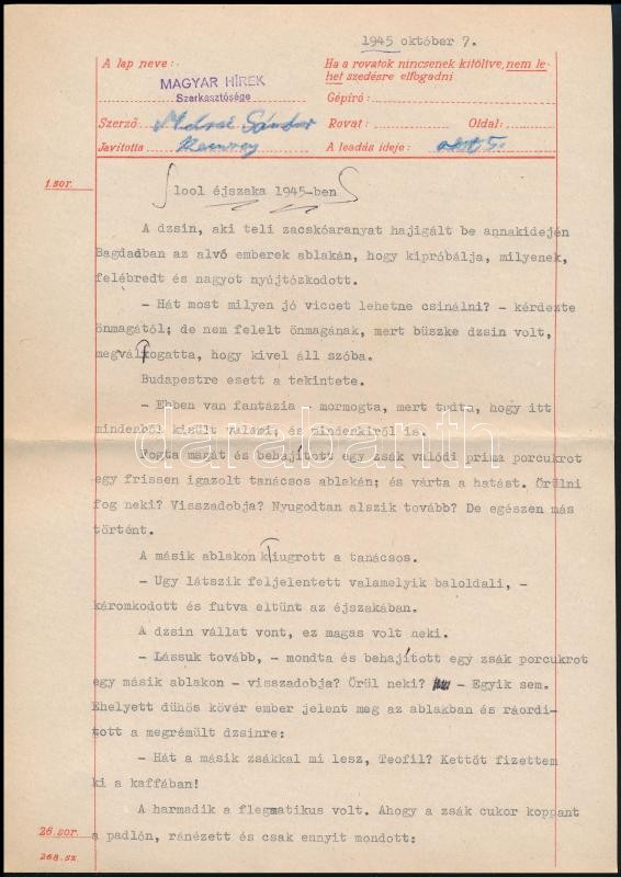 Leírás: 1945 Márai Sándor (1900-1989) írónak a Magyar Hírekben megjelent két írásának nyomdai korrektúrája